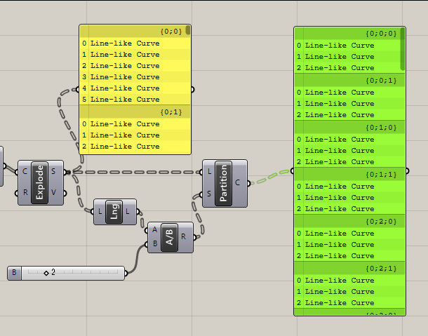 PartitionListというコンポーネントを始めて使いました。入力した数字の数の要素数を持ったブランチに別れるようです。