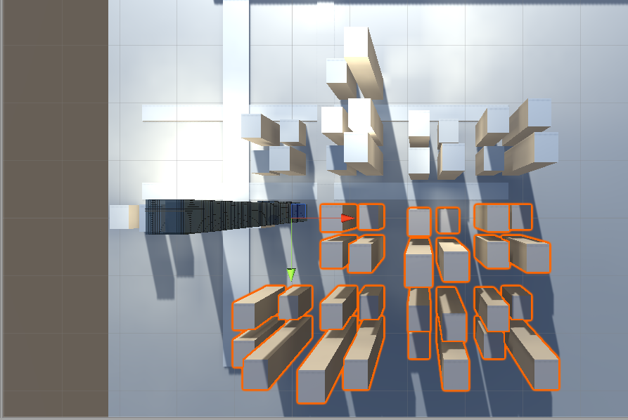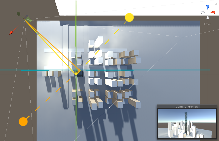 ガラス面に移り込むビルの手前のビルが映り込まないように、ReflectionProbeのCullingMaskを使用しています。CullingMaskでは、レイヤーを指定してチェックが入っていないレイヤーを非表示にすることが出来ます。手前側のビルが邪魔をしないように、Probeに対して手前側の、オレンジに選択されたビル群を、レイヤーに指定して、チェックを外し、映らないように工夫しています。