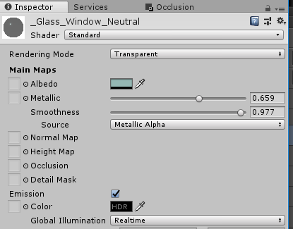 ガラス面をインスペクター上で確認するとReflectionProbeが検出されているのが分かります。それぞれのImportanceが1として設定されているので半々のブレンド率になっているという事が確認できます。
