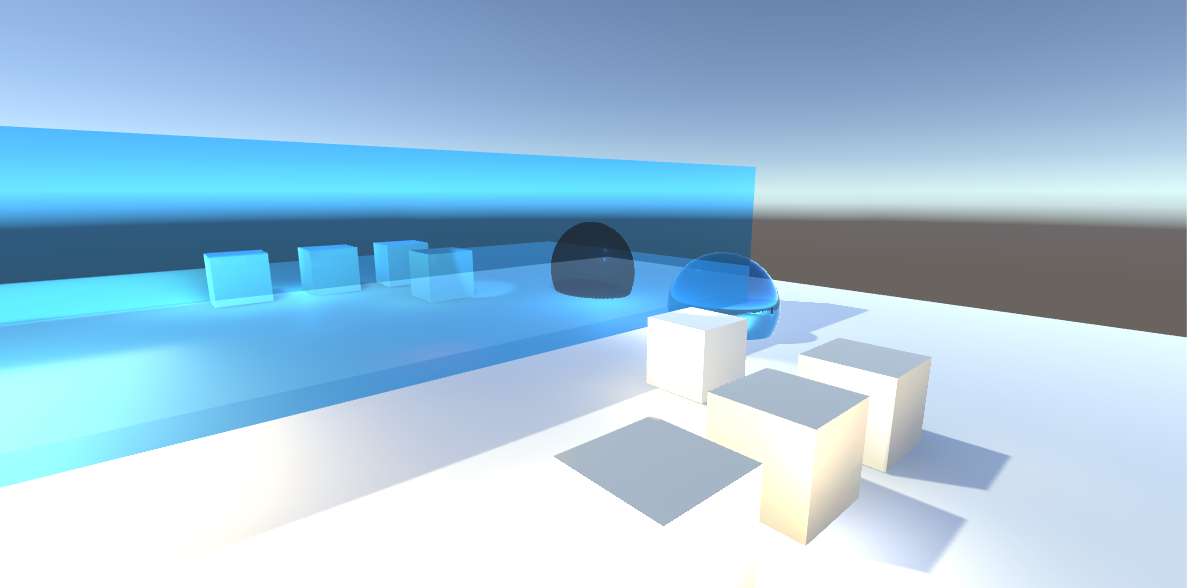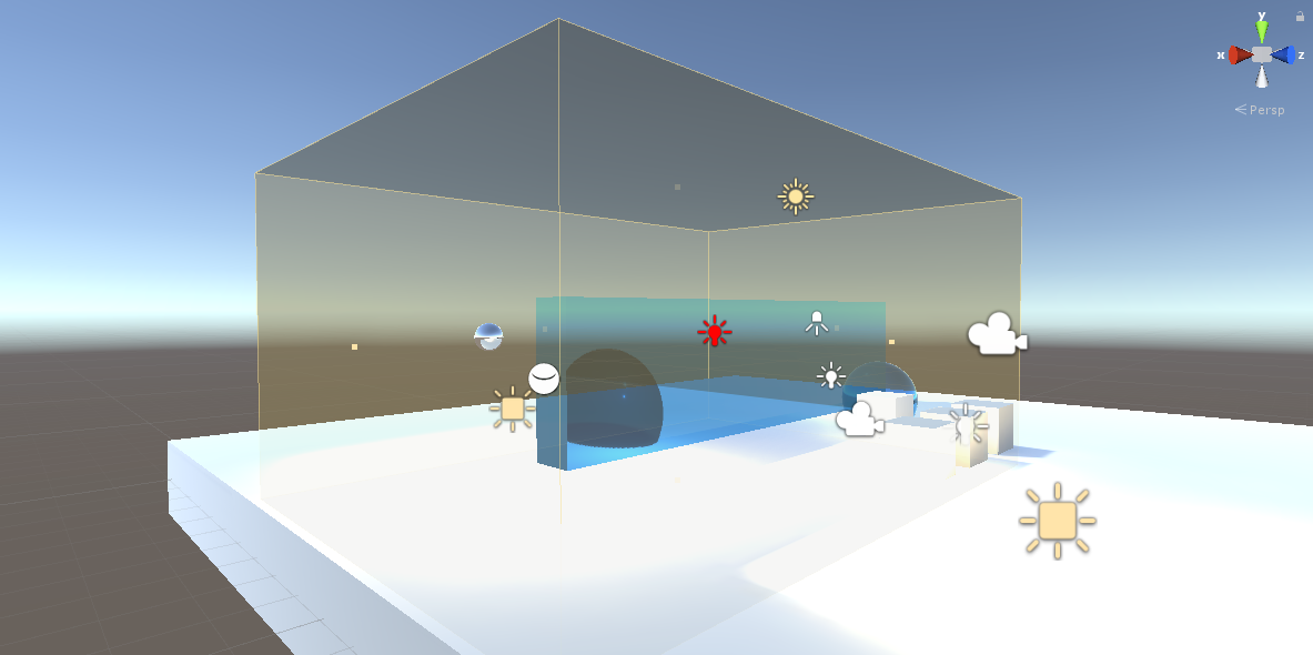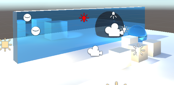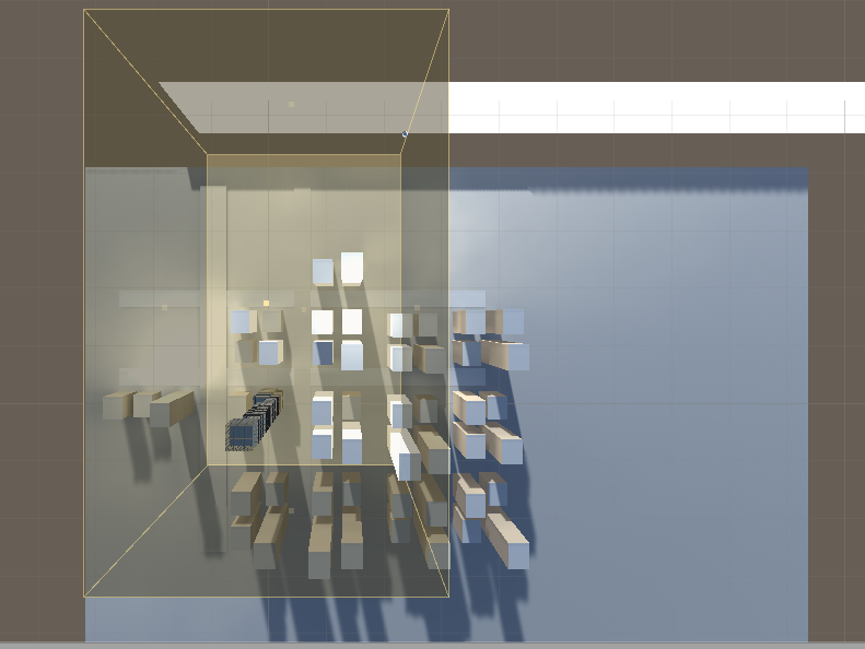 次に、ReflectionProbesのバウンディングボックスの大きさは映り込みが入るオブジェクトを十分にカバーできるサイズにする必要があります。バウンディングボックス外のオブジェクトにはReflectionProbeで作成したマップは適応されません。このボックスは映り込むオブジェクトの範囲ではありません。写り込むのはCullingMaskのチェックが入っているレイヤーに存在するオブジェクト全部だと思います。(CullingMaskについては後述)