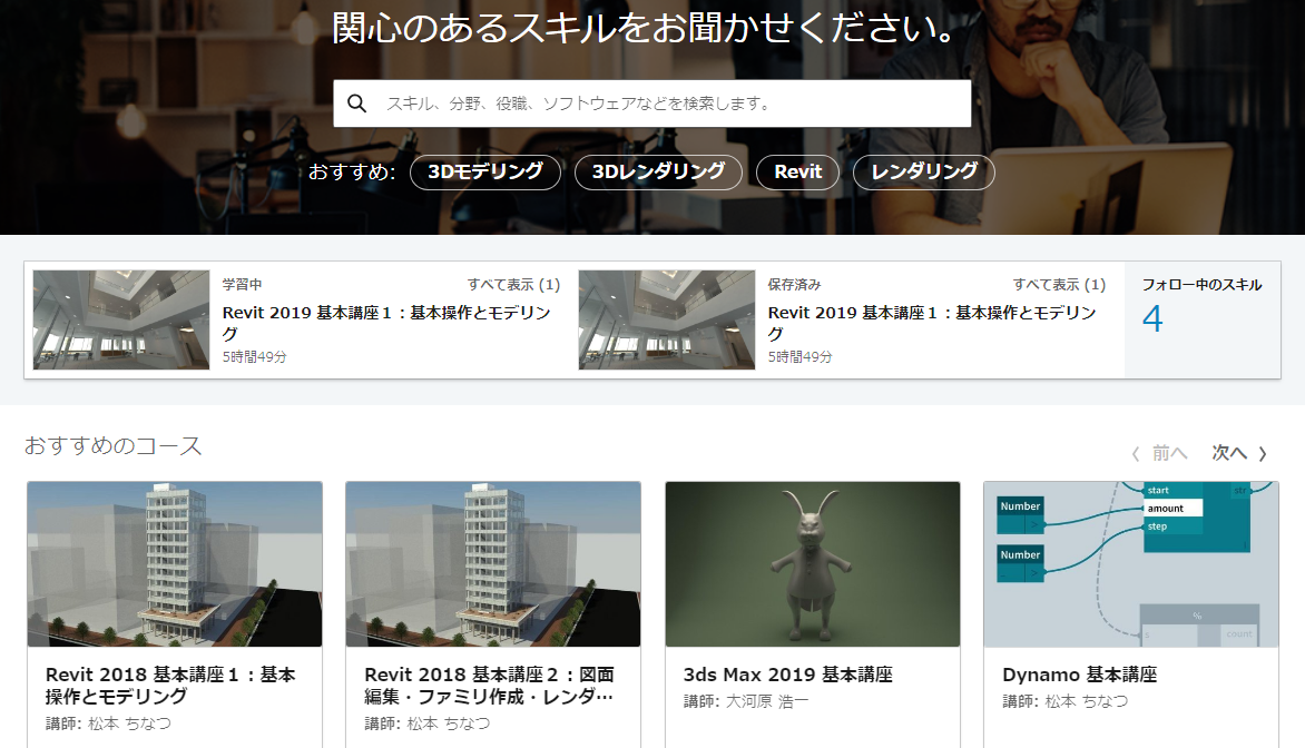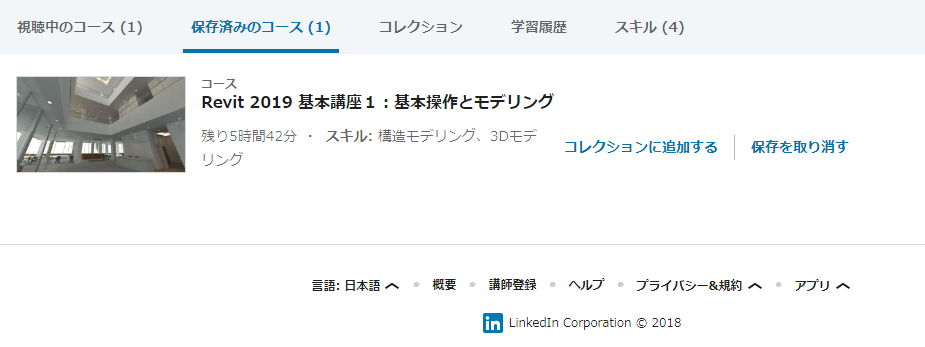 クレカの情報を入れ終わると上の画面になります。言語が日本語になっていると数百程度の日本語のチュートリアルしかヒットしませんが、保存済みのコースの所から、言語を英語にすると、下記のフッターから英語を選択できます。英語で検索すると、数千の結構マニアックなチュートリアルがあるのでお勧めです。例えば、REVITのC#プラグインの作り方なんていうクラスがあるので、現状全く歯が立ちませんが、将来的にはとても期待できます。
