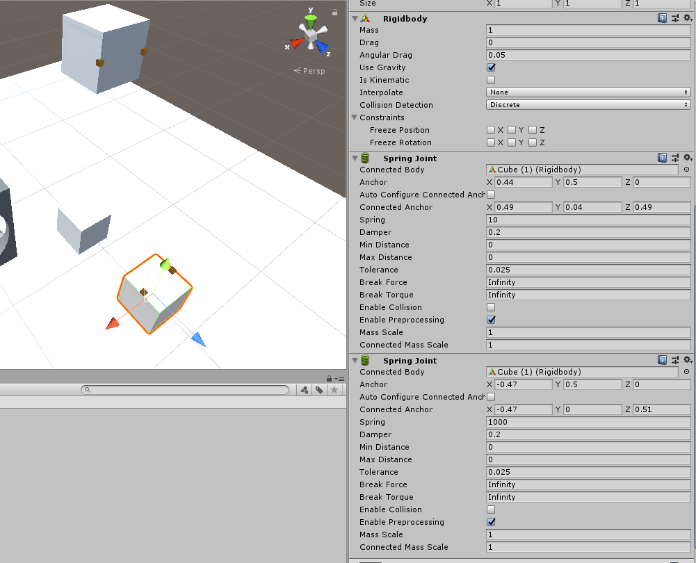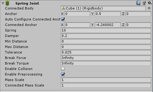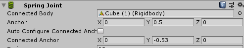 これをばね係数Springをいじっても改善されませんで、上の記事をよく読んだところ、AutoConfigureConnected Anchorのチェックを外して、ConnectedAnchorの位置をキューブの底面にしてあげる必要がありました。