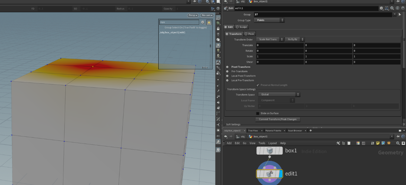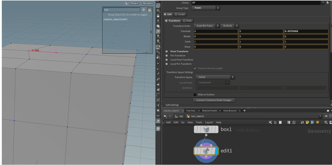 すると、法線方向をz軸とするピボットが出現し、それを動かすと、それに対応して選択した点(37番)がどの方向にどれだけ移動したかというのが数値で自動入力され、editノードに記録されます。