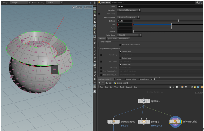 もう一つのやり方として、スフィアの面を選択中にシェルフメニューよりPolyExtrudeを使うと選択した面だけがExtrudeされます。