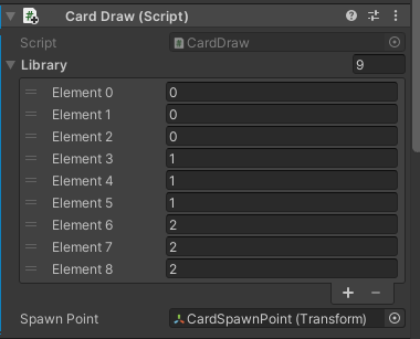 libraryという配列を作り、その中に、インスペクター上で予め山札に欲しいカードを入れておきます。